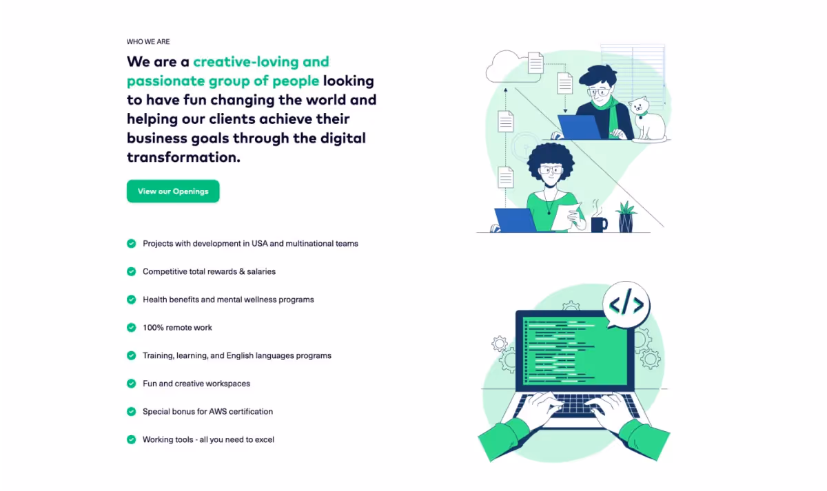 I used a white background sitewide and ditched their old dark blue background for more of a clean, corporate look. For visuals, we chose to use illustrations with a techie yet friendly feel. We also decided to use svg illustrations throughout the site, which improved our load speed immensely.